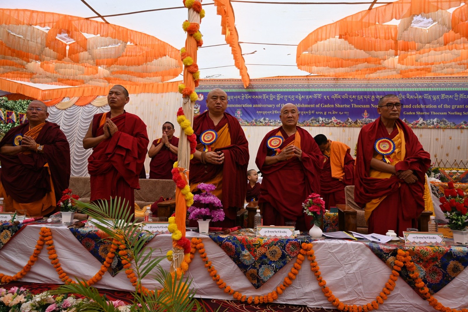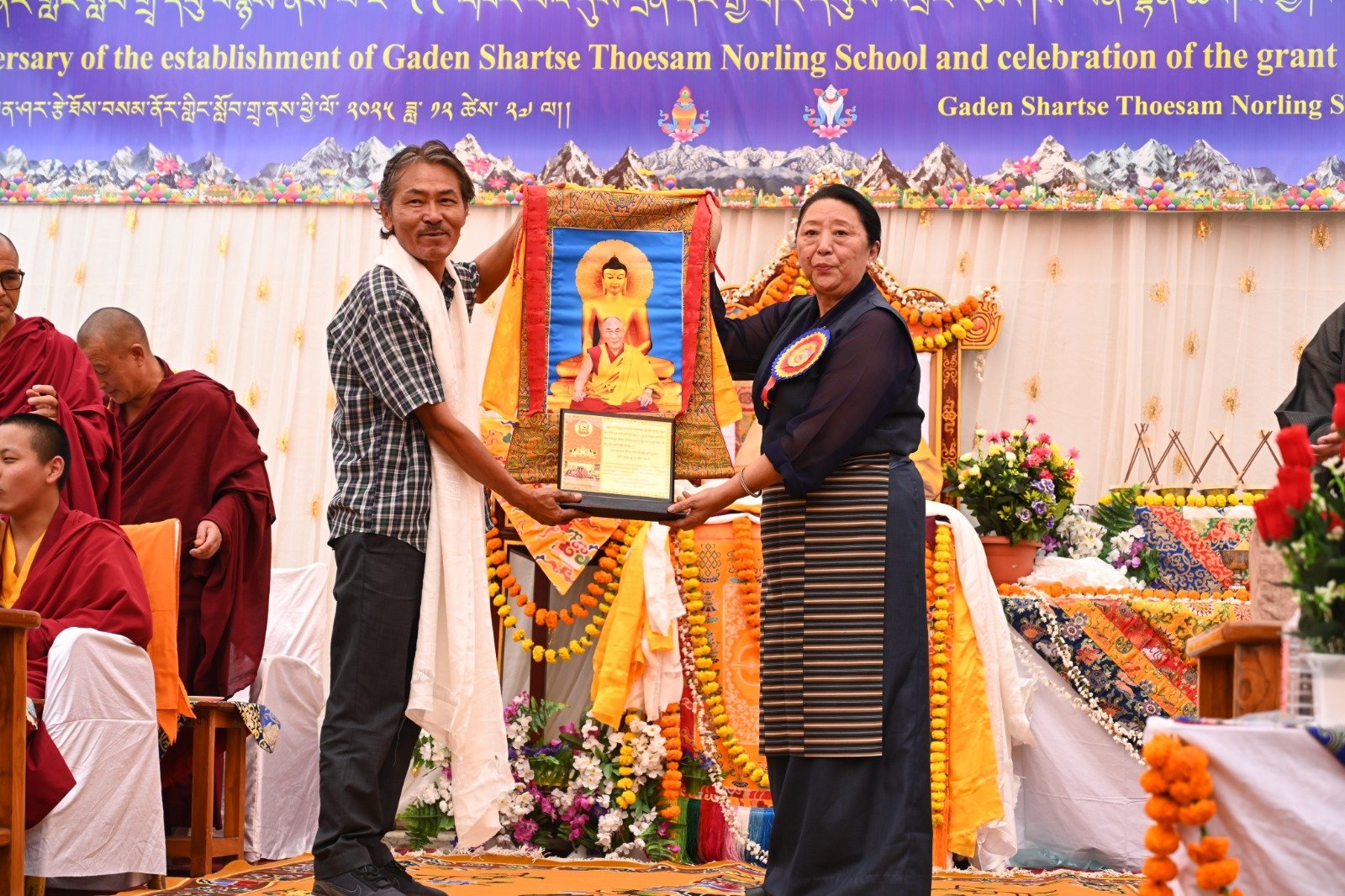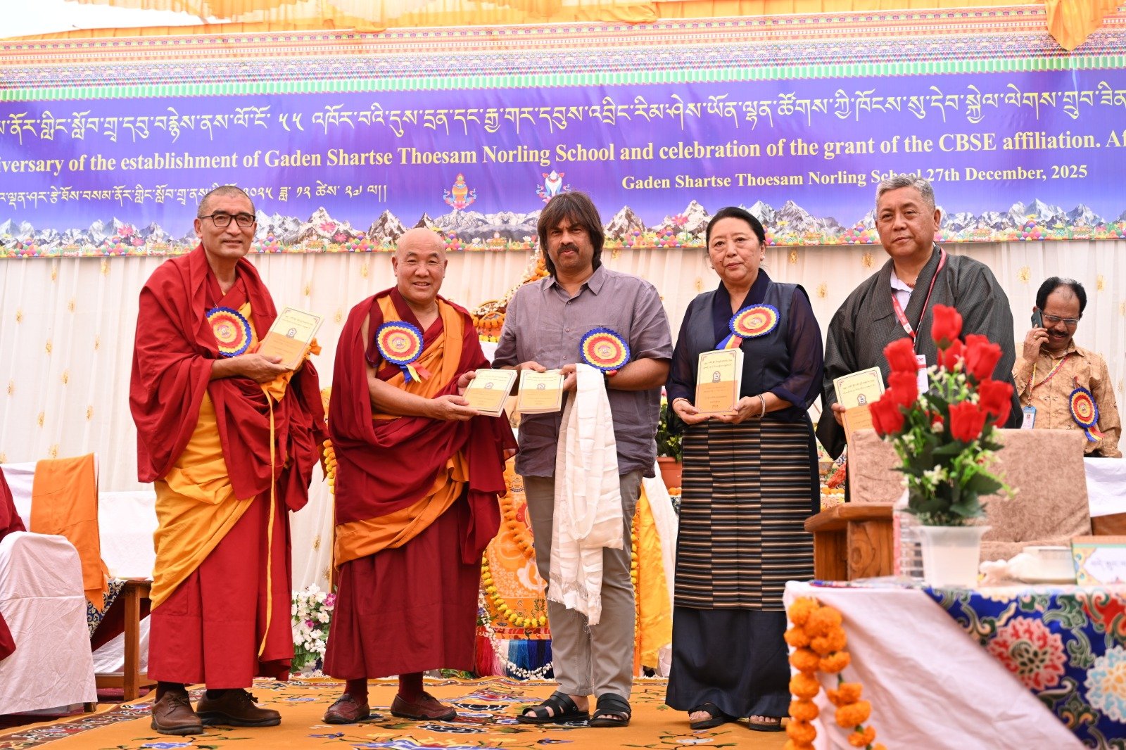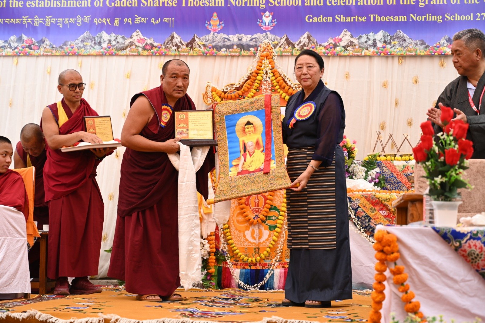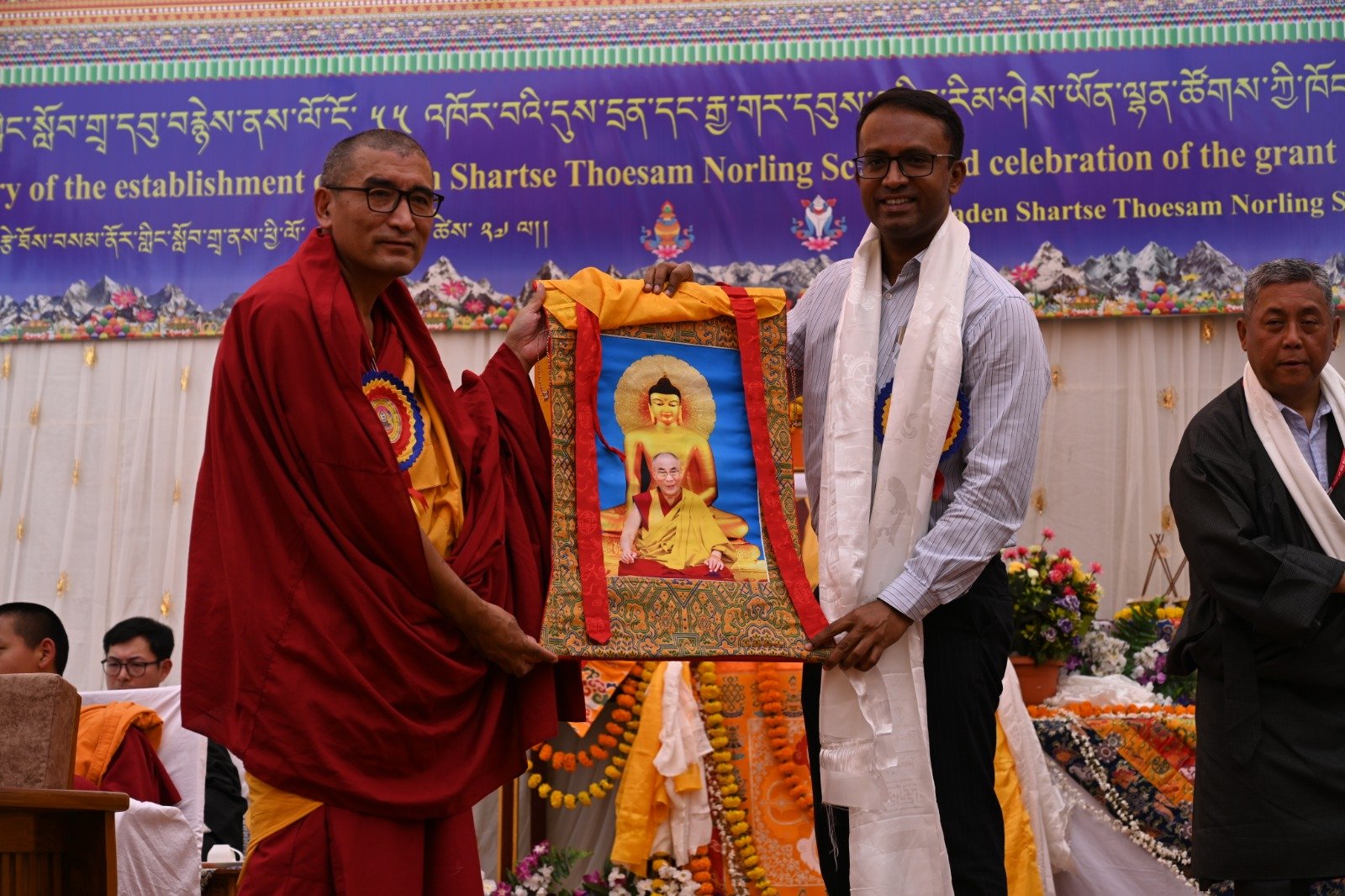 ༄༅། །ཕྱི་ལོ་ ༢༠༢༥ ཟླ་ ༡༢ ཚེས་ ༢༧ རེས་གཟའ་སྤེན་པ་མཆོག་ཏུ་དགེ་བའི་ཉིན་དགའ་ལྡན་ཤར་རྩེ་ཐོས་བསམ་ནོར་གླིང་སློབ་གྲྭར་༧སྐྱབས་གནས་མཁན་རིན་པོ་ཆེ་རྣམ་པ་དང་། རྒྱལ་སྲས་བླ་སྤྲུལ་རྣམ་པ། དགེ་བསྐོས་ལགས་དང་། དབུ་མཛད་ལགས། དགེ་བའི་བཤེས་གཉེན་རྣམ་པ། སྐུ་མགྲོན་གྱི་གཙོ་བོ་མངའ་སྡེའི་གཞུང་གཞི་རིམ་འོག་མའི་ཤེས་རིག་བློན་ཆེན་སྐུ་ཞབས་ Madu Bangarappa མཆོག དམིགས་བསལ་སྐུ་མགྲོན་སྐུའི་གཅུང་མོ་ཨ་མ་རྗེ་བཙུན་པདྨ་ལགས། དབུས་བོད་མིའི་སྒྲིག་འཛུགས་ཀྱི་བདེ་སྲུང་བཀའ་བློན་སྐུ་ངོ་རྒྱ་རི་སྒྲོལ་མ་ལགས། དཔལ་ལྡན་དགའ་ལྡན་ཕོ་བྲང་གི་སྐུ་ངོ་དྲུང་ཆེ་བློ་བཟང་སྦྱིན་པ་ལགས། བཀུར་འོས་སྤྱི་མཐུས་རྣམ་པ། དབུས་བོད་མིའི་སྒྲིག་འཛུགས་ཀྱི་ལྷོ་སྤྱི་སྐུ་ངོ་འཇིགས་མེད་ཚུལ་ཁྲིམས་མཆོག རྒྱ་གར་གྱི་གནད་ཡོད་མི་སྣ་ཁག་གཅིག་དང་། སློབ་གྲྭ་ཁག་གི་སློབ་སྤྱི་རྣམ་པ། གྲྭ་ཚང་གི་སྡེ་ཚན་ཁག་གི་འགན་འཛིན་རྣམ་པ། སློབ་དགེ་རྣམ་པ་དང་། སློབ་ཕྲུག་རྣམས་ལྷན་འཛོམས་ཐོག་དགའ་ལྡན་ཤར་རྩེ་ཐོས་བསམ་ནོར་གླིང་སློབ་གྲྭ་དབུ་བརྙེས་ནས་ལོ་ངོ་ ༥༥ འཁོར་བའི་དུས་དྲན་དང་། རྒྱ་གར་དབུས་འབྲིང་རིམ་ཤེས་ཡོན་ལྷན་ཚོགས་ཀྱི་ཁོངས་སུ་དེབ་སྐྱེལ་ལེགས་གྲུབ་ཟིན་པའི་རྟེན་འབྲེལ་མཛད་སྒོ་ཟབ་རྒྱས་ངང་སྲུང་བརྩི་ཞུས་པའི་བརྙན་པར་འགའ་སྤྱན་འབུལ་ཞུ།