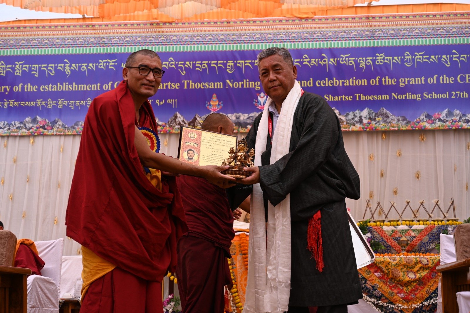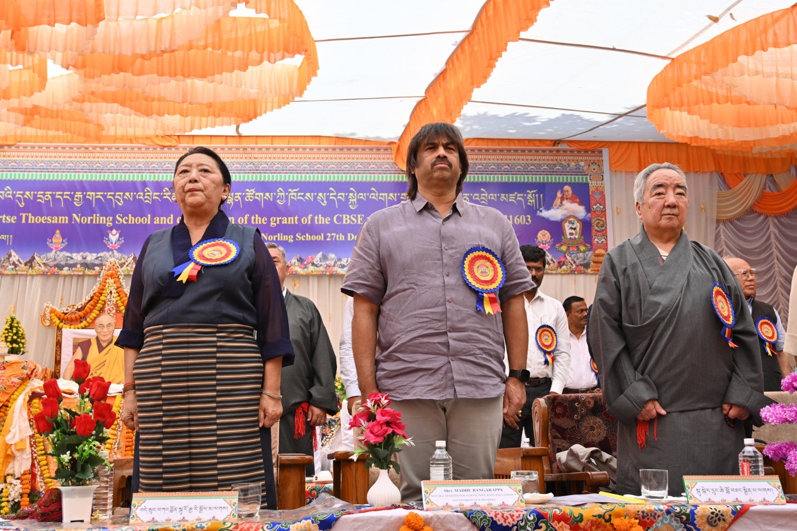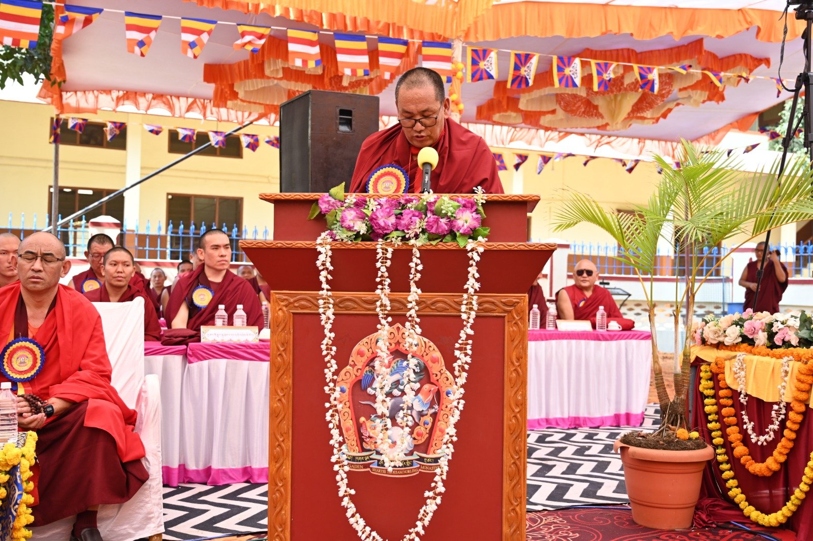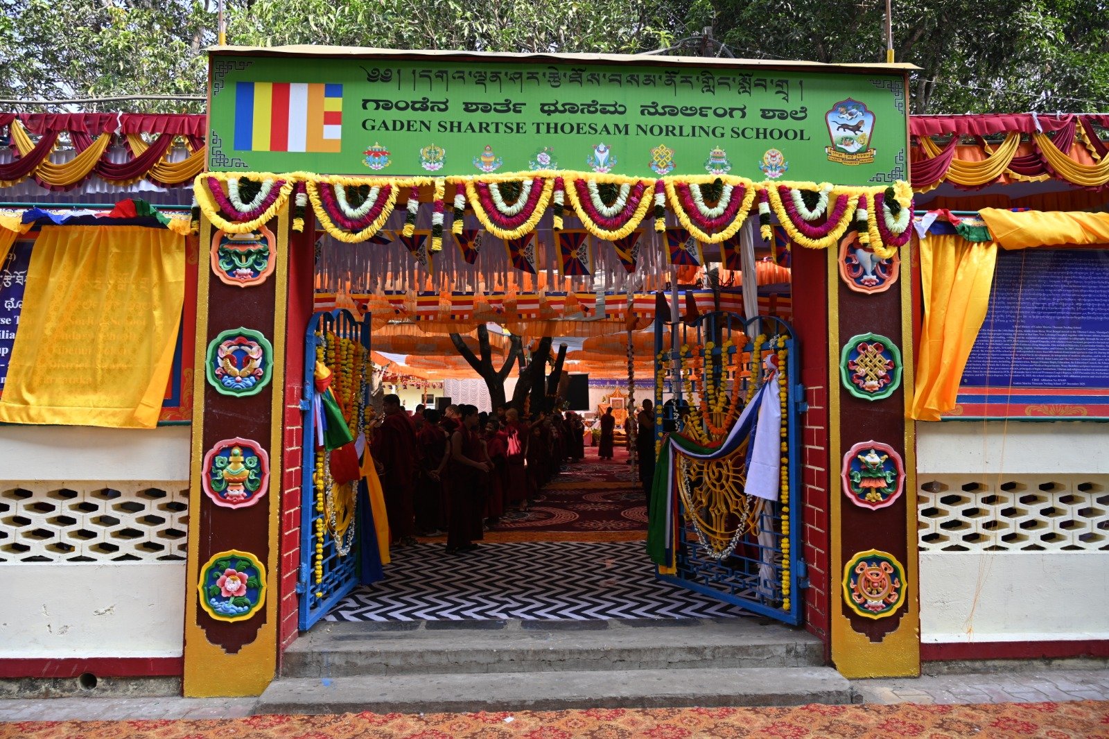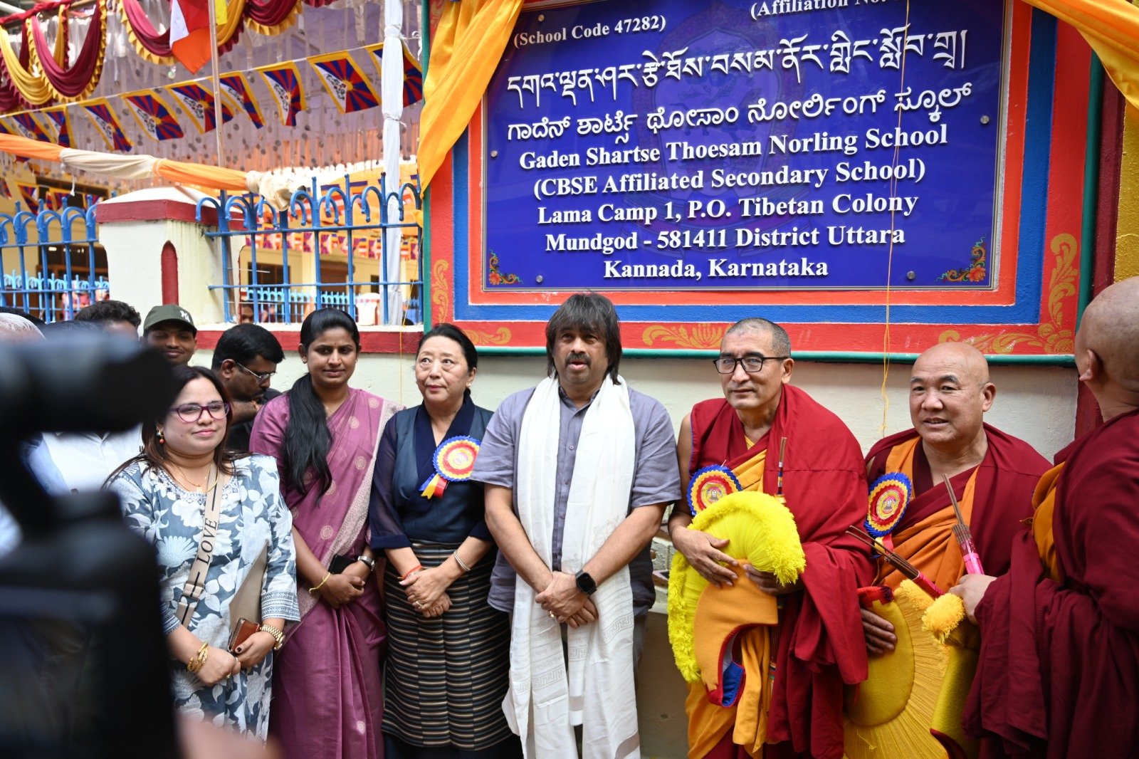 ༄༅། །ཕྱི་ལོ་ ༢༠༢༥ ཟླ་ ༡༢ ཚེས་ ༢༧ རེས་གཟའ་སྤེན་པ་མཆོག་ཏུ་དགེ་བའི་ཉིན་དགའ་ལྡན་ཤར་རྩེ་ཐོས་བསམ་ནོར་གླིང་སློབ་གྲྭར་༧སྐྱབས་གནས་མཁན་རིན་པོ་ཆེ་རྣམ་པ་དང་། རྒྱལ་སྲས་བླ་སྤྲུལ་རྣམ་པ། དགེ་བསྐོས་ལགས་དང་། དབུ་མཛད་ལགས། དགེ་བའི་བཤེས་གཉེན་རྣམ་པ། སྐུ་མགྲོན་གྱི་གཙོ་བོ་མངའ་སྡེའི་གཞུང་གཞི་རིམ་འོག་མའི་ཤེས་རིག་བློན་ཆེན་སྐུ་ཞབས་ Madu Bangarappa མཆོག དམིགས་བསལ་སྐུ་མགྲོན་སྐུའི་གཅུང་མོ་ཨ་མ་རྗེ་བཙུན་པདྨ་ལགས། དབུས་བོད་མིའི་སྒྲིག་འཛུགས་ཀྱི་བདེ་སྲུང་བཀའ་བློན་སྐུ་ངོ་རྒྱ་རི་སྒྲོལ་མ་ལགས། དཔལ་ལྡན་དགའ་ལྡན་ཕོ་བྲང་གི་སྐུ་ངོ་དྲུང་ཆེ་བློ་བཟང་སྦྱིན་པ་ལགས། བཀུར་འོས་སྤྱི་མཐུས་རྣམ་པ། དབུས་བོད་མིའི་སྒྲིག་འཛུགས་ཀྱི་ལྷོ་སྤྱི་སྐུ་ངོ་འཇིགས་མེད་ཚུལ་ཁྲིམས་མཆོག རྒྱ་གར་གྱི་གནད་ཡོད་མི་སྣ་ཁག་གཅིག་དང་། སློབ་གྲྭ་ཁག་གི་སློབ་སྤྱི་རྣམ་པ། གྲྭ་ཚང་གི་སྡེ་ཚན་ཁག་གི་འགན་འཛིན་རྣམ་པ། སློབ་དགེ་རྣམ་པ་དང་། སློབ་ཕྲུག་རྣམས་ལྷན་འཛོམས་ཐོག་དགའ་ལྡན་ཤར་རྩེ་ཐོས་བསམ་ནོར་གླིང་སློབ་གྲྭ་དབུ་བརྙེས་ནས་ལོ་ངོ་ ༥༥ འཁོར་བའི་དུས་དྲན་དང་། རྒྱ་གར་དབུས་འབྲིང་རིམ་ཤེས་ཡོན་ལྷན་ཚོགས་ཀྱི་ཁོངས་སུ་དེབ་སྐྱེལ་ལེགས་གྲུབ་ཟིན་པའི་རྟེན་འབྲེལ་མཛད་སྒོ་ཟབ་རྒྱས་ངང་སྲུང་བརྩི་ཞུས་པའི་བརྙན་པར་འགའ་སྤྱན་འབུལ་ཞུ།