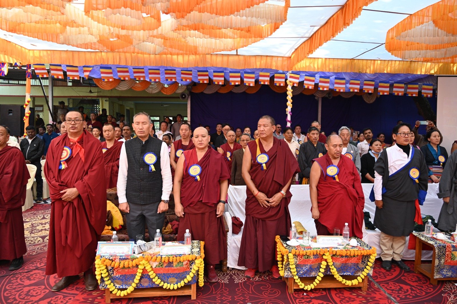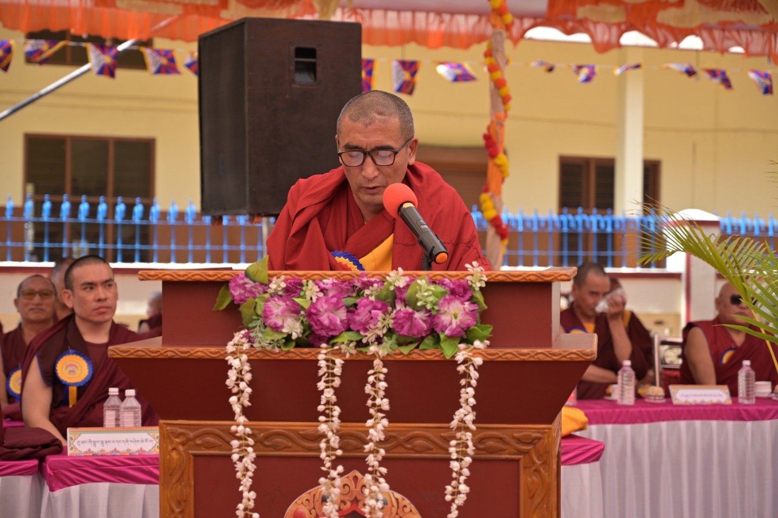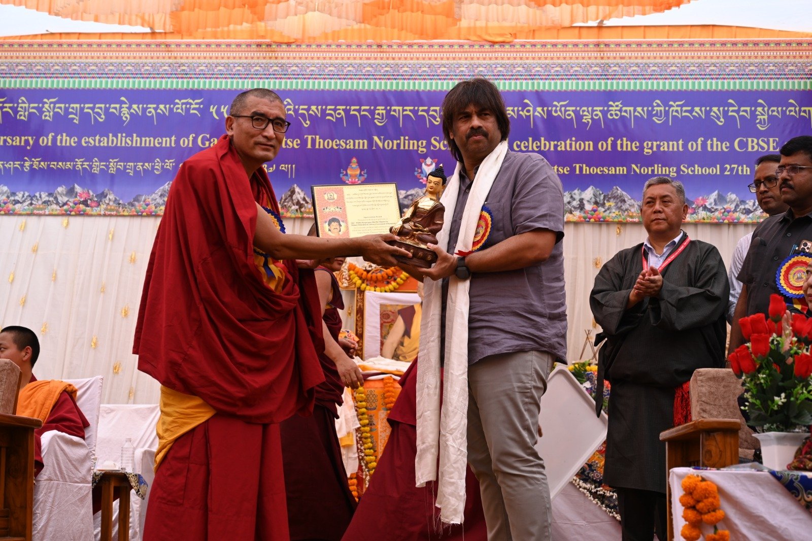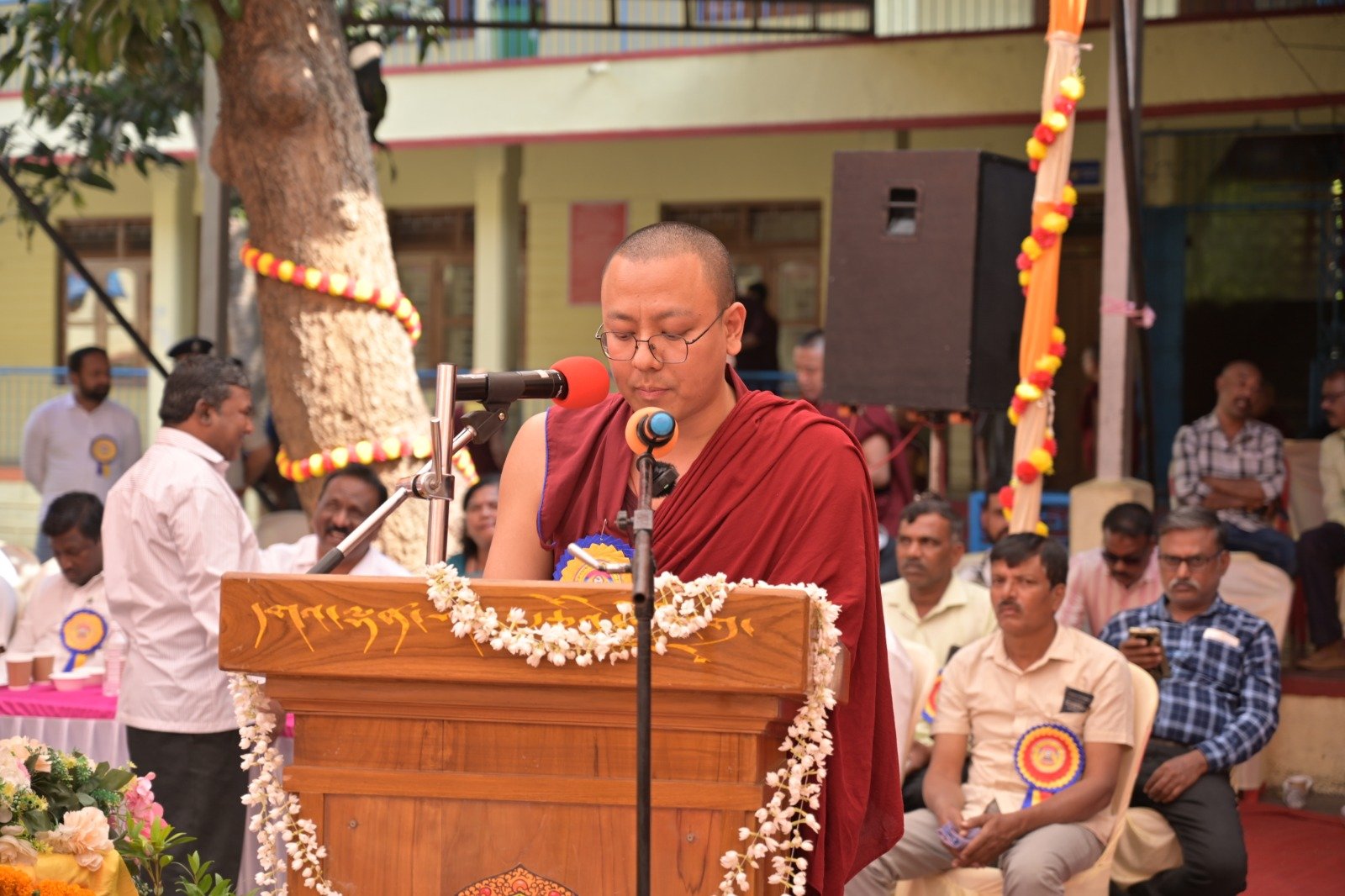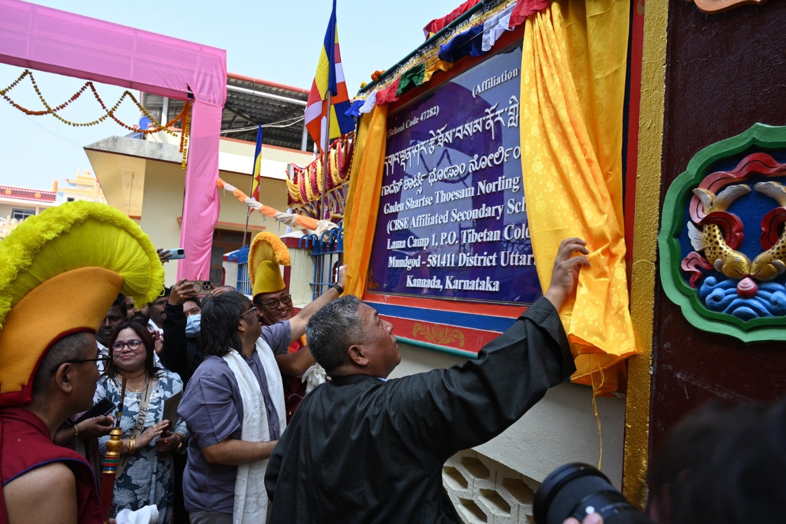 ༄༅། །ཕྱི་ལོ་ ༢༠༢༥ ཟླ་ ༡༢ ཚེས་ ༢༧ རེས་གཟའ་སྤེན་པ་མཆོག་ཏུ་དགེ་བའི་ཉིན་དགའ་ལྡན་ཤར་རྩེ་ཐོས་བསམ་ནོར་གླིང་སློབ་གྲྭར་༧སྐྱབས་གནས་མཁན་རིན་པོ་ཆེ་རྣམ་པ་དང་། རྒྱལ་སྲས་བླ་སྤྲུལ་རྣམ་པ། དགེ་བསྐོས་ལགས་དང་། དབུ་མཛད་ལགས། དགེ་བའི་བཤེས་གཉེན་རྣམ་པ། སྐུ་མགྲོན་གྱི་གཙོ་བོ་མངའ་སྡེའི་གཞུང་གཞི་རིམ་འོག་མའི་ཤེས་རིག་བློན་ཆེན་སྐུ་ཞབས་ Madu Bangarappa མཆོག དམིགས་བསལ་སྐུ་མགྲོན་སྐུའི་གཅུང་མོ་ཨ་མ་རྗེ་བཙུན་པདྨ་ལགས། དབུས་བོད་མིའི་སྒྲིག་འཛུགས་ཀྱི་བདེ་སྲུང་བཀའ་བློན་སྐུ་ངོ་རྒྱ་རི་སྒྲོལ་མ་ལགས། དཔལ་ལྡན་དགའ་ལྡན་ཕོ་བྲང་གི་སྐུ་ངོ་དྲུང་ཆེ་བློ་བཟང་སྦྱིན་པ་ལགས། བཀུར་འོས་སྤྱི་མཐུས་རྣམ་པ། དབུས་བོད་མིའི་སྒྲིག་འཛུགས་ཀྱི་ལྷོ་སྤྱི་སྐུ་ངོ་འཇིགས་མེད་ཚུལ་ཁྲིམས་མཆོག རྒྱ་གར་གྱི་གནད་ཡོད་མི་སྣ་ཁག་གཅིག་དང་། སློབ་གྲྭ་ཁག་གི་སློབ་སྤྱི་རྣམ་པ། གྲྭ་ཚང་གི་སྡེ་ཚན་ཁག་གི་འགན་འཛིན་རྣམ་པ། སློབ་དགེ་རྣམ་པ་དང་། སློབ་ཕྲུག་རྣམས་ལྷན་འཛོམས་ཐོག་དགའ་ལྡན་ཤར་རྩེ་ཐོས་བསམ་ནོར་གླིང་སློབ་གྲྭ་དབུ་བརྙེས་ནས་ལོ་ངོ་ ༥༥ འཁོར་བའི་དུས་དྲན་དང་། རྒྱ་གར་དབུས་འབྲིང་རིམ་ཤེས་ཡོན་ལྷན་ཚོགས་ཀྱི་ཁོངས་སུ་དེབ་སྐྱེལ་ལེགས་གྲུབ་ཟིན་པའི་རྟེན་འབྲེལ་མཛད་སྒོ་ཟབ་རྒྱས་ངང་སྲུང་བརྩི་ཞུས་པའི་བརྙན་པར་འགའ་སྤྱན་འབུལ་ཞུ།